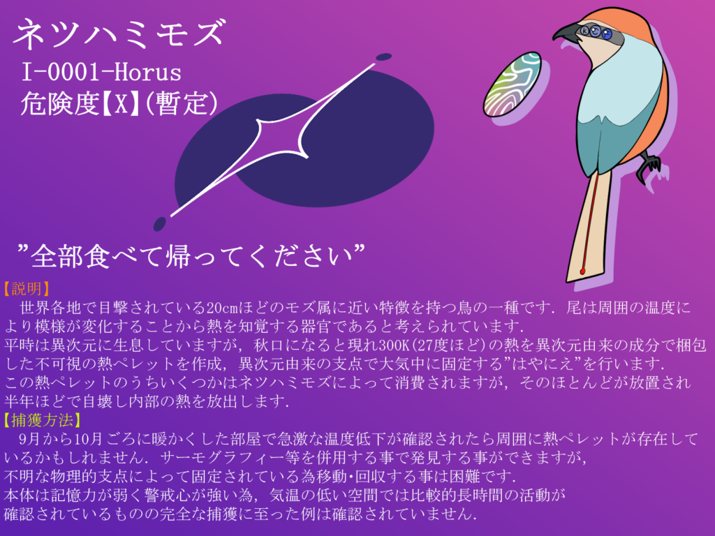 世界各地で目撃されている20cmほどのモズ属に近い特徴を持つ鳥の一種です.尾は周囲の温度により模様が変化することから熱を知覚する器官であると考えられています. 平時は異次元に生息していますが,秋口になると現れ300K(27度ほど)の熱を異次元由来の成分で梱包した不可視の熱ペレットを作成,異次元由来の支点で大気中に固定する”はやにえ”を行います. この熱ペレットのうちいくつかはネツハミモズによって消費されますが,そのほとんどが放置され半年ほどで自壊し内部の熱を放出します.