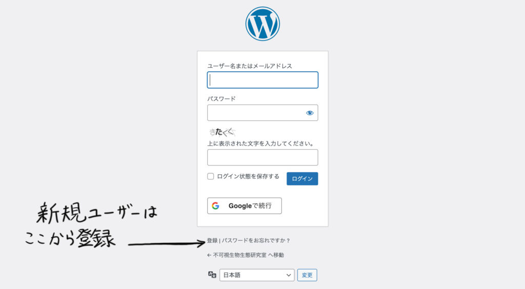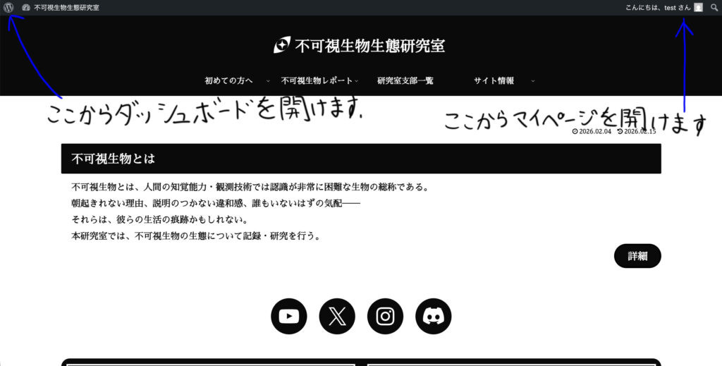 3.投稿権限が与えられたら「不可視生物レポート」と「研究室支部」の記事が書けるようになります。ページ上部に表示される黒い帯から、一番左のアイコンをクリックし、ダッシュボードを開きます。