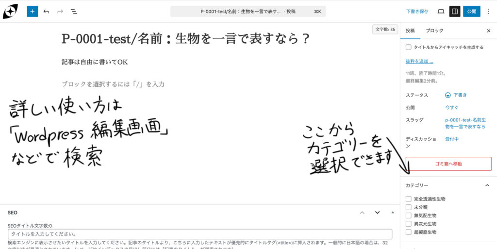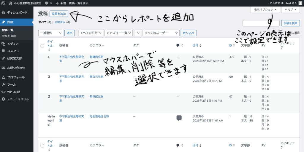 4.「不可視生物レポート」を投稿したい場合、左側のメニュー(スマホでは左上のアイコンをタップすると出てくるメニュー)から「投稿」を選びます。ページ上部に現れる「投稿を追加」をクリックします。カテゴリーを必ず選択し、記事を自由に書いてください。(カテゴリーは「保存」のすぐ左にあるアイコンをクリックすると出てくるメニュー内にあります。)