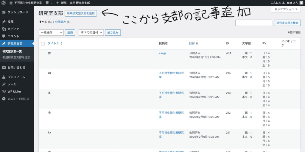 5.「研究室支部」では、あなたが立ち上げた研究室支部に関する情報を書き込むページを作成できます。「研究室支部」を投稿したい場合、左側のメニューから「研究室支部」を選びます。ページ上部に現れる「研究室支部を追加」ボタンをクリックし、記事を自由に書いてください。※このページは一人何十ページも投稿することを想定していません。一度作った記事を編集するようしてください。複数ページ作りたい場合、数ページに収まるようにしてください。