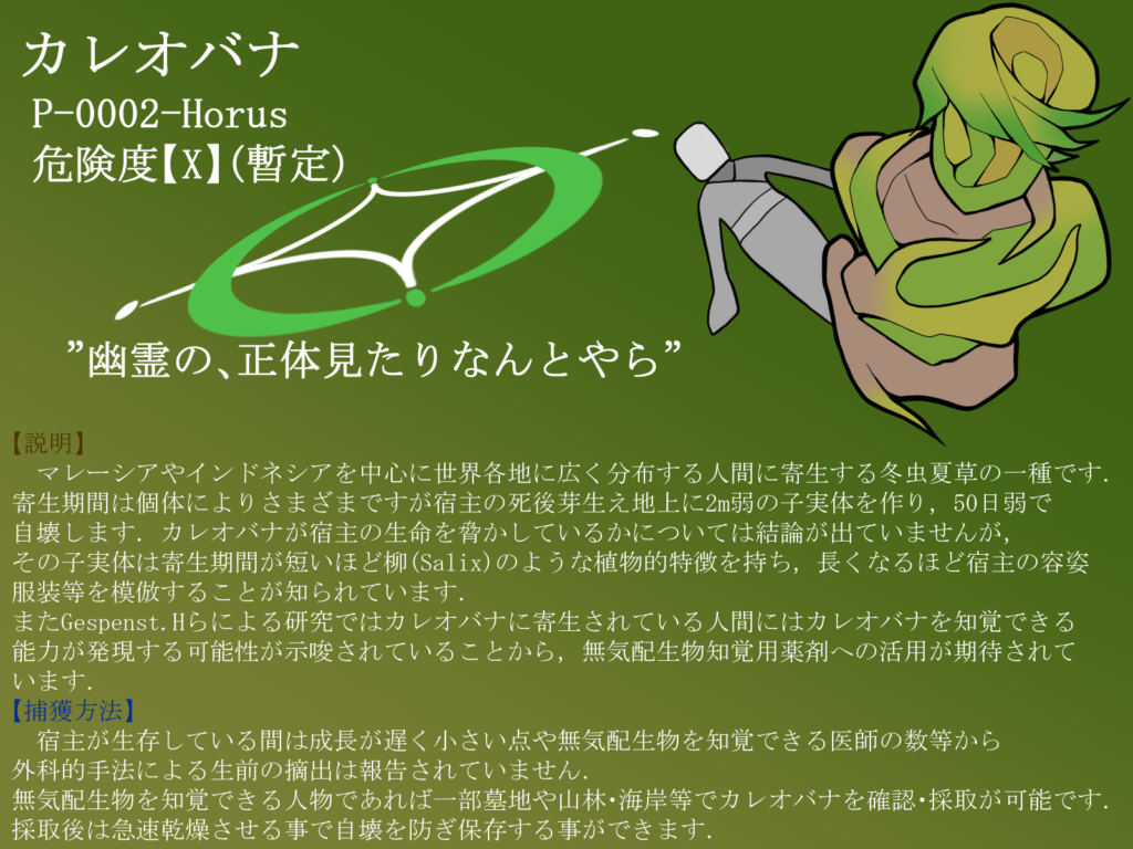 無気配生物を知覚できる人物であれば一部墓地や山林・海岸等でカレオバナを確認・採取が可能です.採取後は急速乾燥させる事で自壊を防ぎ保存する事ができます.