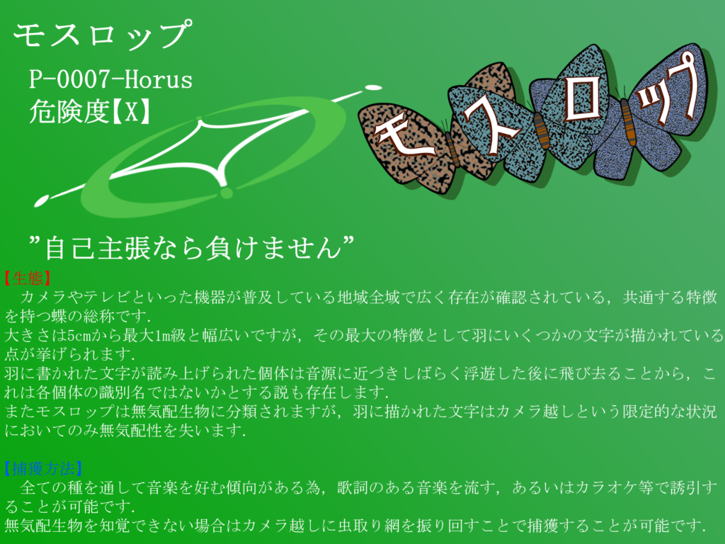 またモスロップは無気配生物に分類されますが,羽に描かれた文字はカメラ越しという限定的な状況においてのみ無気配性を失います.