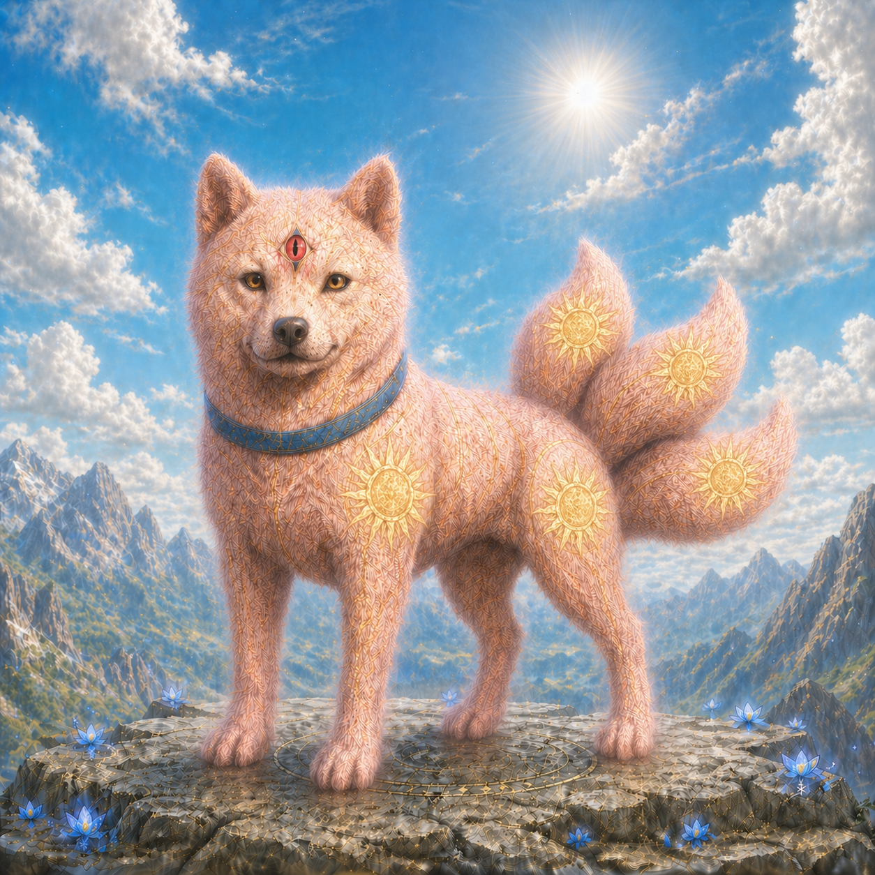 通常のシヴァ犬とは異なり、薄い赤色の体毛に黄色の太陽の模様が刻まれた見た目をしており、額の第三の眼は充血している。