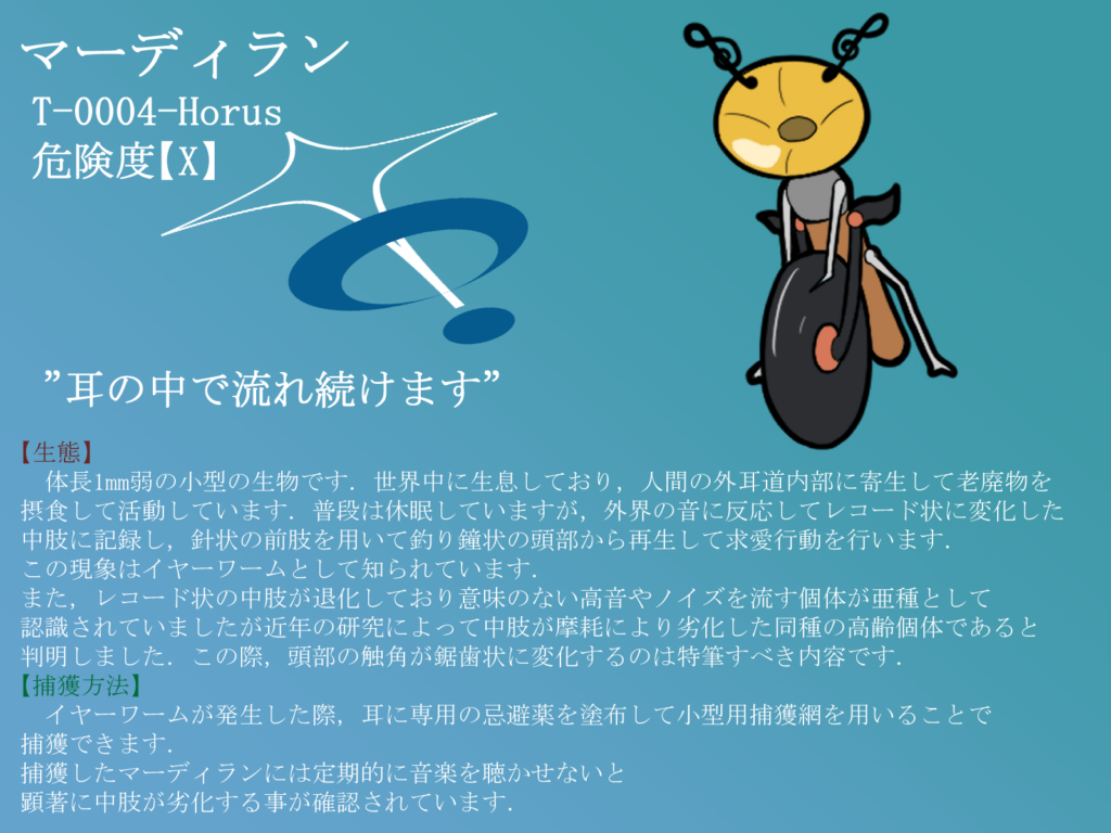 体長1mm弱の小型の生物です.世界中に生息しており,人間の外耳道内部に寄生して老廃物を摂食して活動しています.普段は休眠していますが,外界の音に反応してレコード状に変化した中肢に記録し,針状の前肢を用いて釣り鐘状の頭部から再生して求愛行動を行います.この現象はイヤーワームとして知られています. また,レコード状の中肢が退化しており意味のない高音やノイズを流す個体が亜種として認識されていましたが近年の研究によって中肢が摩耗により劣化した同種の高齢個体であると判明しました.この際,頭部の触角が鋸歯状に変化するのは特筆すべき内容です.